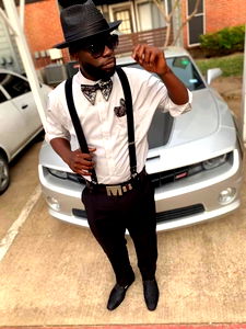 A man exudes confidence, standing beside a sports car with his hands on his hips. He is dressed in a sharp suit and tie, topped off with a fedora. The scene takes place in an urban setting with a clear sky overhead.