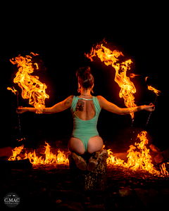 A provocative OnlyFans model performing with a flaming torch, showcasing an unusual and thrilling act.