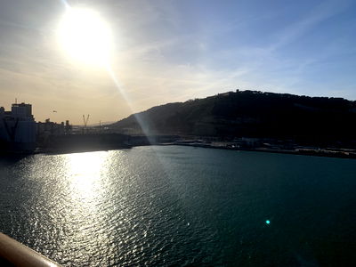 Gavin captured this peaceful moment of the sun setting over a harbor with a cityscape in the background, as seen from an elevated deck. The scene is bathed in warm light and calm waters reflecting the sky.