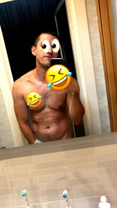 The image shows a male OnlyFans model posing shirtless with face emojis and a humorous expression. The background is blurred but suggests a domestic setting. He appears to be in good shape, indicating fitness or bodybuilding interests.