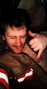 Man wearing a firefighting suit thumbs up, likely in the midst of an emergency or celebrating his profession.