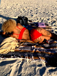 A OnlyFans model, Genny is featured in this image in a red bikini. She's striking an athletic pose with one hand on her hip and the other arm stretched upwards. Her stance suggests a sense of confidence and strength.