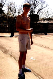 The image shows a young man with a bodybuilder's physique, wearing white shorts and athletic shoes. He is posing outdoors on what appears to be a basketball court. The model has short hair and is looking directly at the camera.