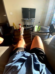 An onlyfans model with the foot of a person visible, lying on bed with sheets and blanket. The caption is blurred out for privacy.
