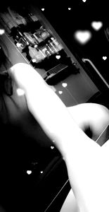 Stylized black and white image of a young woman with long hair, captured from a low angle looking up at her. The background is blurred but suggests an urban setting.