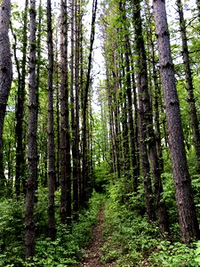 The image depicts a tranquil scene of a dirt path leading through a forest of tall trees. The path is flanked by trees on both sides, creating a natural tunnel. The sky is overcast, casting a soft light over the scene, enhancing the lush greenery of the trees and the surrounding foliage.