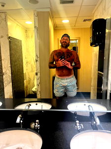 Gmart214, a popular OnlyFans model, is seen in a public restroom bathroom. He's dressed in swimwear and stands confidently in front of the mirror, capturing his reflection. The image gives a glimpse into Gmart214's life outside the digital realm.