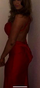 An elegant evening event, featuring a captivating model dressed in a vibrant red gown. The event is set to take place in the heart of London, UK, under the starlight with a hint of sophistication.