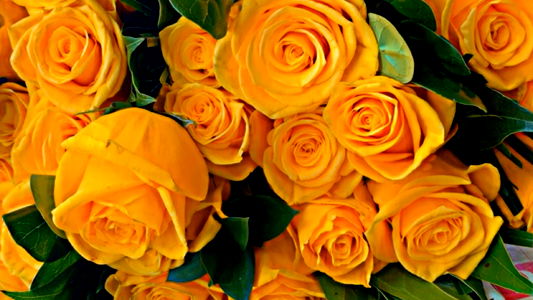 A bouquet of fresh, vibrant yellow roses. The image showcases the beauty and brightness of these roses, making them an excellent choice for expressing love, appreciation, or congratulations. With their delightful color, they would make a stunning centerpiece or a lovely gift.