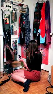 An OnlyFans model is seen sitting on the floor, holding a phone. In front of her is a large mirror reflecting her image. She's dressed casually in a black top and jeans. The room has a casual vibe, with personal items and clothing scattered around.