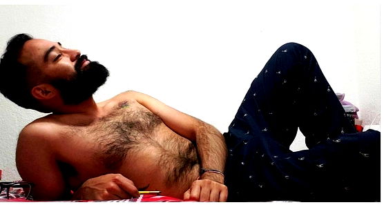 Onlyfans model, beard and mustache, shirtless, posing for camera, chest hair visible.