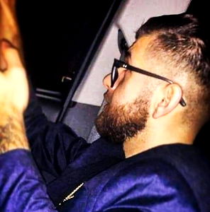 A young man, possibly from Las Vegas, is seen sitting in the back of a car. He sports a beard and glasses, and appears to be looking out the window. His style seems casual, with a jacket that has a notable emblem on it. The lighting suggests it might be evening or night, giving the photo a cool, urban vibe.