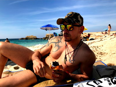 Enjoying a sunny day at the beach, Guss & Matt are having a great time with their snacks. They're looking relaxed and soaking up the beautiful weather.
