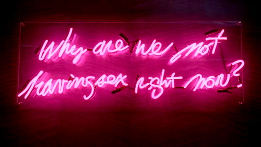 An individual dressed in an erotic costume, including a face mask and bikini, is holding up a phone for a selfie. The individual appears to be in a room with purple lighting.