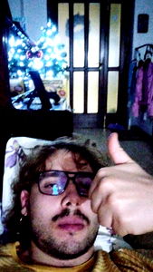 A young adult with glasses gives a thumbs-up sign, seemingly approving of something or someone out of frame. Behind them is a warmly lit room with a Christmas tree, hinting at the holiday season. The individual appears to be indoors, likely in their own space, radiating positivity.