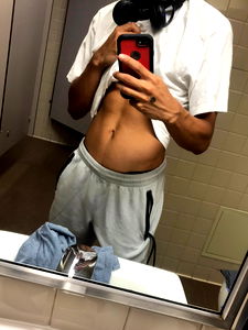 A shirtless photo of a man with well-defined abs. He is standing indoors and appears to be in his 20s or 30s.