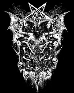 A highly detailed black and white illustration featuring a model with dark hair, red tattoos, multiple piercings, and horns. The art style is reminiscent of gothic or horror aesthetics. The model is depicted in a dynamic pose with wings and horns, suggesting a devilish or demonic theme.