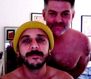 In this vibrant image, two friends are captured in a moment of camaraderie. The bearded man on the left, donned in a yellow beanie and matching mustache, radiates a sense of adventure and carefree spirit. His companion on the right, sporting a beard and a tattoo, is casually dressed in a black tank top. They both share an affinity for bold accessories - the friend on the left sports a ring while his counterpart has a chain around his neck. This image encapsulates their journey through life's colorful tapestry.