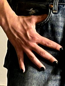 This is a photo of an OnlyFans model, Brady x, from Australia. He's wearing a black t-shirt and jeans, with his nails painted in a dark color. The focus of the image is on his hands, which are prominently displayed.