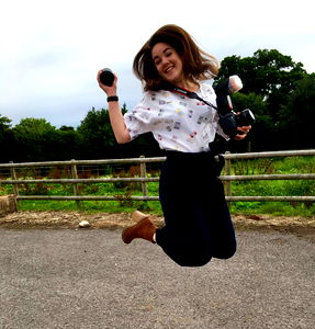 Han is captured mid-jump, camera in hand, radiating excitement against a rural backdrop. 25 year old photographer embraces the moment.