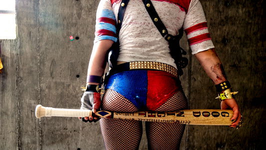 A striking image captures Izzy in a Harley Quinn cosplay. She is standing in front of a green screen backdrop, her vibrant red and black striped top contrasting with the cool tones of the background. Her blonde hair, styled in a messy updo, adds to her energetic look. A noticeable smirk plays on her lips as she strikes a pose for this memorable photograph.