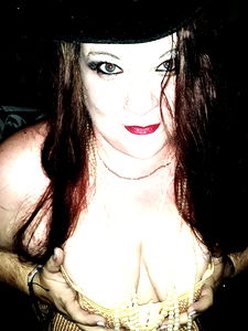 In the image, the model is dressed in a western-inspired outfit, complete with a cowboy hat and pearls. They are wearing a blue bodysuit adorned with white pearls and beads, accessorized with a necklace featuring a large pearl pendant. The individual has long red hair and their makeup includes dark lipstick, which is in harmony with the overall theme of the image.