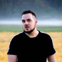 An image of Harry the Hornycub, a young adult male with a beard and mustache, standing in a field. His gaze is directed off to the side.