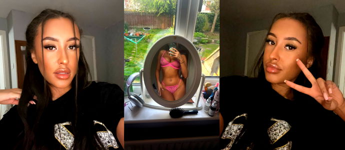 This image features the stunning OnlyFans model Hazel Webb from the UK. She is seen in a playful pose, showcasing her large breasts and manicured nails. The photo captures her confident and alluring personality.