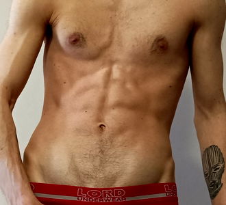 A fitness model demonstrating a toned abdomen, captured from behind. He wears branded sports gear and appears to be part of the Onlyfans community, as suggested by the text 'Shoved between your thighs', indicating an alluring or seductive pose. The background is nondescript and does not distract from the model's physique.