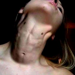 Headliner, a popular OnlyFans model, pays tribute to their vocal cords in this striking image. They are captured from the neck down, with a close-up of their shirtless chest revealing a distinct tattoo and an open collar. The deep neckline adds an element of intrigue to the overall composition. Headliner's intense gaze draws the viewer into the frame, making this a captivating piece.