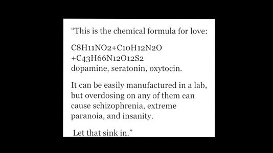 A scientific breakdown of the essence of love, including a labyrinthine 25-letter symbol. The image suggests that love can be easily manufactured in a lab setting, but it also contains a warning about the dangers of overdosing on them.
