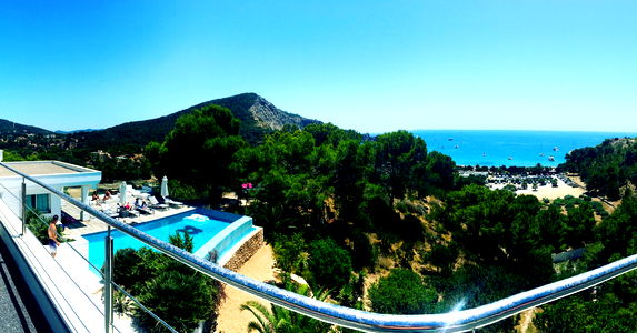 Elevated aerial view of a luxurious villa, complete with an infinity pool and a breathtaking coastal vista. A perfect blend of modern architecture and natural beauty.
