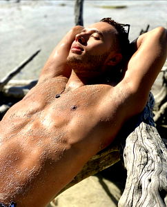 Nico, the onlyfans model from Miami, FL, takes a moment to relax on the beach. His ripped physique is on full display as he lounges on a driftwood bench. The sunlight casts long shadows, hinting at a warm, sunny day. His toned muscles glisten under the light, showcasing his dedication to fitness.