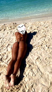 A stunning image of an OnlyFans model named HiddenHeaven, wearing a white top, captured in a beach setting. She is standing waist-deep in the ocean, under a starless sky. The model's face is obscured by a mask bearing the iconic Guy Fawkes' symbol, adding an air of mystery. In the background, palm trees sway gently, creating a serene and tropical ambiance. This image perfectly encapsulates the allure of OnlyFans models in exotic locations.