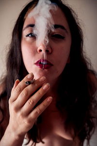 A provocative and dramatic image featuring the OnlyFans model Honey Bee engrossed in a smoke. She holds a cigarette, her eyes closed as she takes a puff, creating an atmosphere of relaxation and indulgence. The setting is simple yet evocative with soft lighting that accentuates her features.