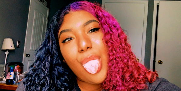 Honeyy Bee, a San Antonio based OnlyFans model, is seen in this image. She is wearing a vibrant pink and blue hairdo that adds to her youthful appearance. Her playful pose with a peace sign suggests she's ready for a fun and energetic day.