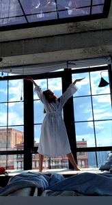 Stylish young woman with wavy hair, wearing a white top and posing in front of a window. She has a confident smile and is looking directly at the camera.