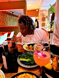 These are some photos of the Huntsville-based model enjoying a meal in a restaurant setting. The table is laden with dishes and drinks, showcasing a relaxed dining experience.