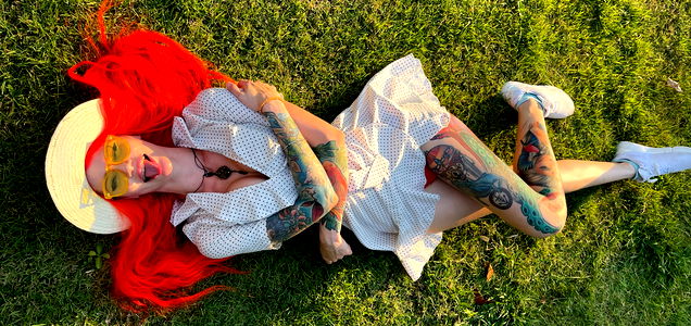 This is a captivating image of a young woman who is in her early twenties. The highlighted feature of this image is her striking red hair which cascades down to her shoulders. The vibrant color of her hair is further accentuated by her decision to color it, bringing a fiery hue that matches her fearless, expressive personality. Her face, at the center of the image, is flawlessly made up, with a notable application of lipstick. The color of the lipstick is bold and dramatic, complementing her hair color and adding to her overall look. This sense of fashion extends beyond her makeup as she is seen wearing a fashionable accessory and a piece of clothing that seem to contribute to her unique sense of style. The colors in the image are vibrant with a notable presence of yellow, creating a warm, inviting atmosphere. Overall, the image could be a creative expression of a young woman's daring style and personality, or possibly a promotional image for a fashion or beauty campaign.