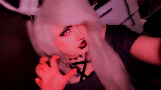 In a room bathed in red light, Daisy, a model on Onlyfans, strikes an intense pose with her red demon makeup. Her vibrant look is accentuated by the matching red hair and accessories, creating a striking image.