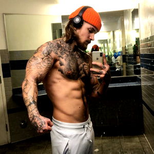 This image features a well-built man, likely in his early thirties, showcasing his well-defined muscles and physique. The focus of the image is on the man's bare chest, revealing a broad, muscular torso. His chiseled abs, a testament to his dedication to bodybuilding, are clearly visible. His arms, just as toned, extend from his body, with the elbows slightly bent. The man's face, partially covered by a beard, exudes determination and focus. The beard, along with the man's age, suggests a level of maturity and experience. A tattoo, an intricate design etched on his skin, adds a unique element to his overall appearance. He is shirtless, with his flesh appearing healthy and robust, reflecting his physical fitness. His bare chest and stomach are indicative of a routine of rigorous training and discipline. The backdrop appears to be a simple wall, putting the man and his muscular form in sharp focus. The image portrays strength, discipline, and the art of bodybuilding in its rawest form.