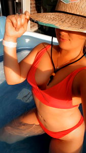 Kat, a lively model from Texas, enjoys her time in a pool with a vibrant red bikini. She is playfully posing in a straw hat, embodying the summer spirit.