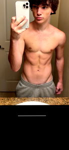 This image captures a young man, approximately 22 years old, in a private moment of self-reflection within a domestic setting. His shirtless torso, lean and muscular, reflects a disciplined commitment to physical fitness. The contours of his well-defined chest and stomach muscles are highlighted by the soft indoor lighting. He stands bare-chested in front of a mirror, holding an object, perhaps a grooming tool or fitness accessory, showcasing his strong shoulders and upper arms. The expression on his face is contemplative, perhaps evaluating his physical progress or preparing for the day ahead. His facial features, although partially obscured by the angle, reveal a certain youthful charm. The backdrop of the image is a tastefully decorated bathroom, complete with a wall characterized by its minimalist design. The scene conveys a sense of solitude and introspection, suggesting that the subject is comfortable with his physicality and enjoys spending time focusing on his well-being. The image overall presents a candid snapshot of modern masculinity.
