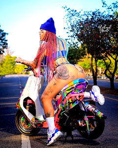 Indiafressh, known for her vibrant fashion and captivating presence, is seen riding a colorful Vespa scooter in an urban setting. She exudes confidence and energy, embodying the youthful spirit of the city.