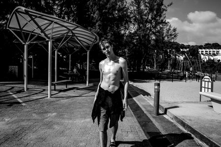 A young male model with short hair and a serious expression, posing for a portrait. He is dressed in casual attire, suggesting an urban setting. Chris Evans JR seems to be taking his modeling career seriously, showcasing his professional side.
