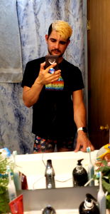OnlyFans model Issiahs_Closet, known for his chest hair and beard, poses shirtless in a bathroom mirror. His unique style and confident demeanor make him stand out on the platform.