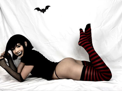 A striking image of a female model exuding gothic charm, dressed in dark clothing and red stockings, set against a backdrop of flying bats and a cloud of smoke. The model's expressive face adds an element of mystery to the composition.