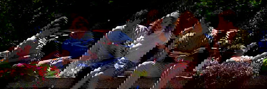 A lively scene of four friends enjoying their time at the park. They are engaged in different activities, with one person looking into her phone while another is seen eating a snack. The background shows a peaceful setting with greenery and a clear blue sky.