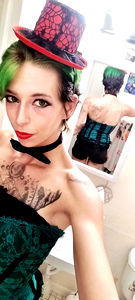 Itty bitty is an Onlyfans model known for her unique and alluring style. She is seen here in a striking red dress, with green hair that adds to her distinctive appearance. Her confident pose suggests she's comfortable in front of the camera.