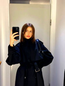 In this image, Kaylee is captured in a candid moment. She's wearing a casual black shirt and her hair is styled up, giving her a stylish look. Her eyes are looking directly into the camera, engaging with the viewer. The background appears to be indoors, suggesting she might be at home or in a studio setting.